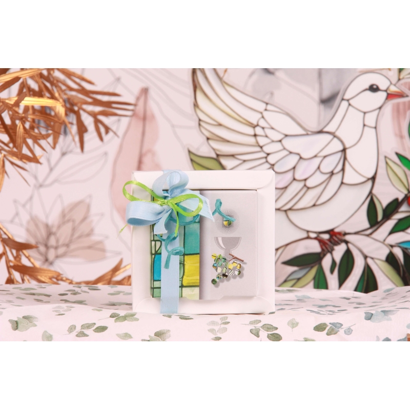 Une boite cartonnée blanche avec couvercle imprimé "vitraux et calice" (8,5*8,5*H2,5cm), un ruban bleu ciel en satin mâte 10mm, un ruban en satin vert 3mm et une corde à croller bleu turquoise 3mm.