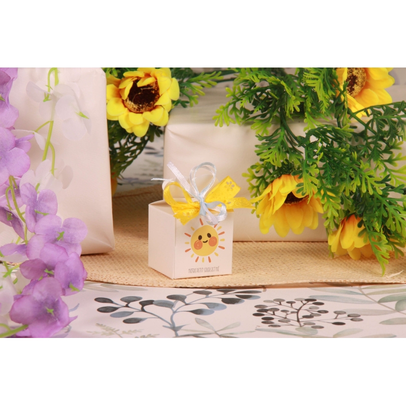 A white cardboard box with sun printed relief closure and "Our little sun is born" (4*4cm), a 12mm yellow cut flower satin ribbon, a 3mm sky blue satin ribbon and a 3mm white satin ribbon.