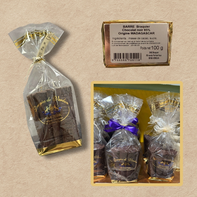 A bar of 85% dark chocolate, 100g package, made in the Braquier factory from cocoa beans from Madagascar.