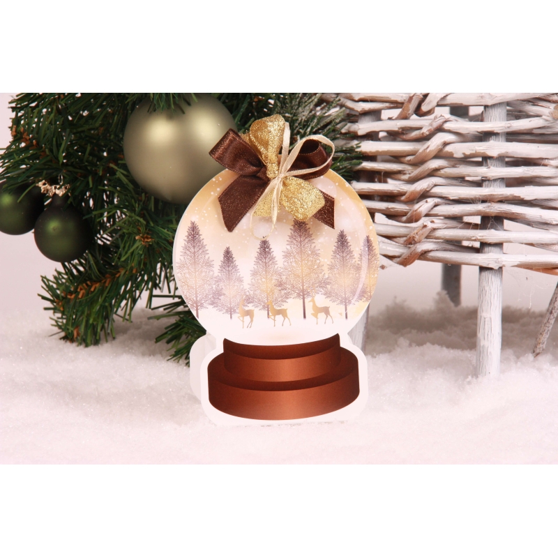 A cardboard box in the shape of a snowball printed forest and Rennes (2.5x4.6xH6.2cm), a 15mm brown satin ribbon, a 10mm gold organza ribbon and a 3mm taupe satin ribbon.