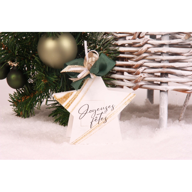 A white and gold star-shaped cardboard box printed "Happy Holidays" (11x4xH11cm), a 25mm fir green cotton ribbon, a 10mm gold organza ribbon and a 3mm white satin ribbon.