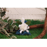 Un pochon en coton bleu marine à petits pois blancs (9x10,5cm), un ruban en satin mâte blanc 10mm, un fleur en tissu blanche (Ø5cm) et un brun de muguet en tissu.