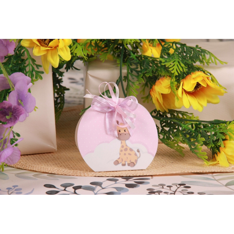 Une boite cartonnée imprimée Girafon et nuage (10,5*5*H8cm), un ruban voile bordure satin lilas 10mm, un ruban en satin rose 3mm et un ruban en satin blanc 3mm.