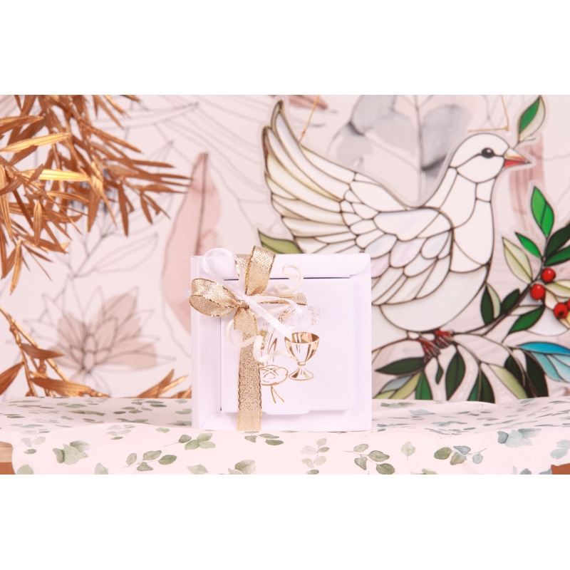 Une boite cartonnée blanche avec couvercle imprimé Calice or (8,5*8,5*H2,5cm), un ruban organdi or 10mm, un ruban en satin écru 3mm et une corde à croller blanche 3mm.
