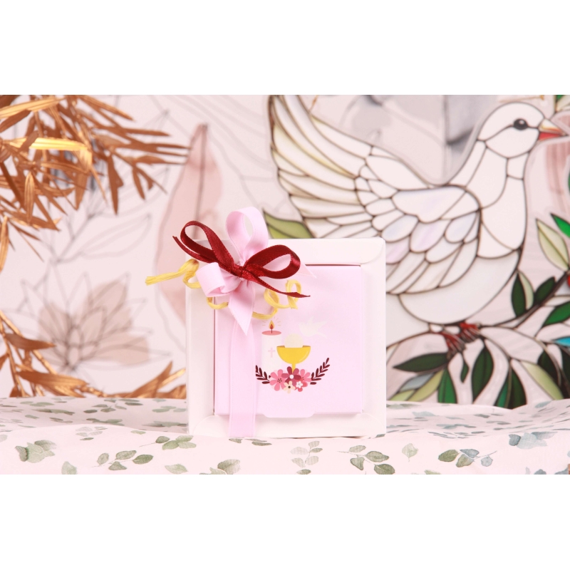 Une boite cartonnée avec couvercle imprimé " Calice et Colombe " (8,5x8,5xH2,5cm), un ruban rose en satin mâte 10mm, un ruban en satin bordeaux 6mm et une corde à croller jaune 3mm.