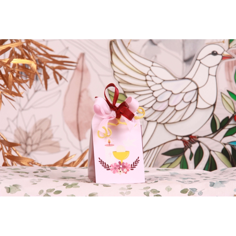 Une boite cartonnée forme trapèze " Calice et Colombe " (5*5*H8cm), un ruban rose en satin mâte 10mm, un ruban en satin bordeaux 6mm et une corde à croller jaune 3mm.