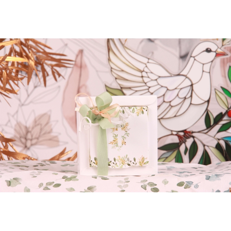 Une boite cartonnée avec couvercle imprimé " Croix fleurie " (8,5x8,5xH2,5cm), un ruban vert olive en coton 10mm, un ruban en satin saumon 3mm et une corde à croller blanche 3mm.