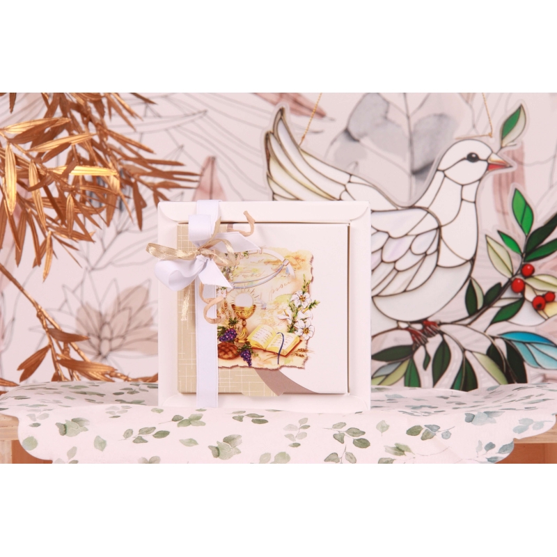 Une boite cartonnée blanche avec couvercle imprimé dessin chrétien (11*11*H2,5cm), un ruban en satin mâte blanc 10mm, un ruban en satin taupe 3mm et une corde à croller beige 3mm.