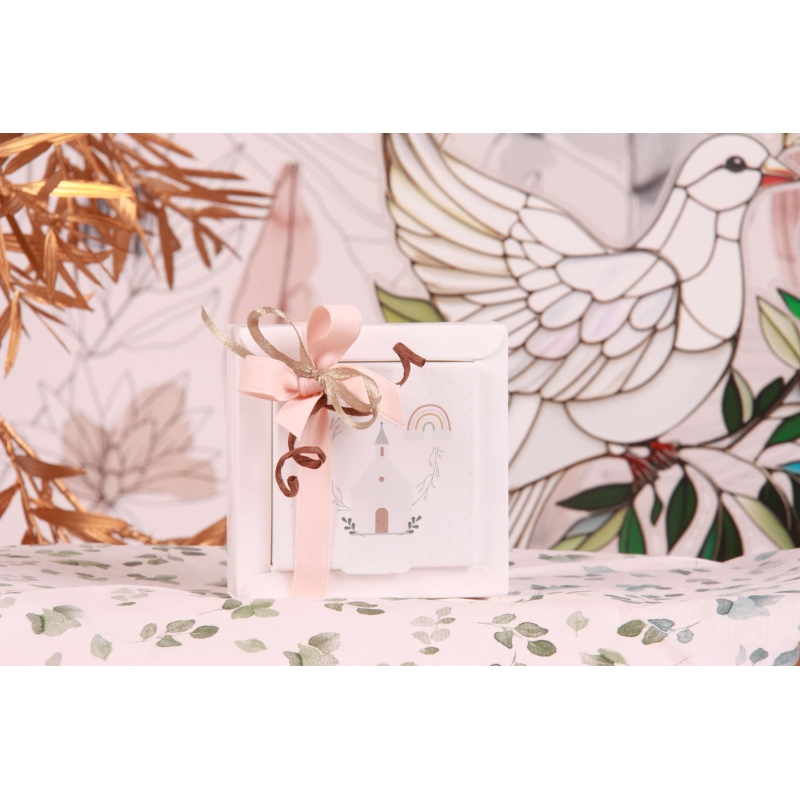 Une boite cartonnée blanche avec couvercle imprimé église arc en ciel (8,5*8,5*H2,5cm), un ruban en satin mâte saumon 10mm, un ruban en satin taupe 3mm et une corde à croller brune 3mm.