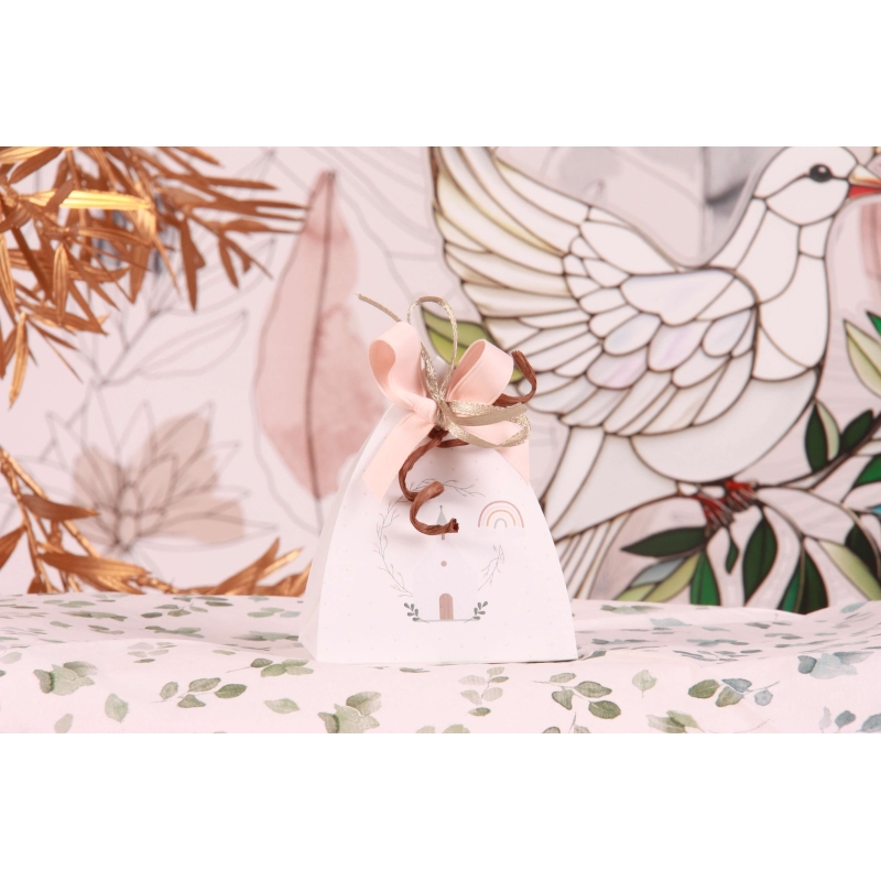 Une boite cartonnée imprimée église arc en ciel (7*4*H8cm), un ruban en satin mâte saumon 10mm, un ruban en satin taupe 3mm et une corde à croller brune 3mm.