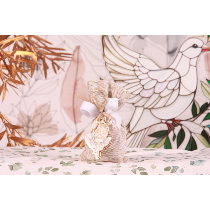 Un pochon en coton taupe relief Ramage blanc (5*5*H11cm), un ruban en satin mâte blanc 10mm, un ruban en satin taupe 3mm et un accessoire en bois Mitre (3*H5cm).