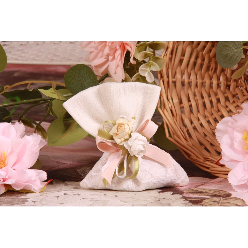 Un pochon en lin écru doublé dentelle écru (11*H13cm), un ruban en satin mâte saumon 10mm, un ruban en satin blanc 3mm, un ruban en satin kaki 6mm, une Rose en papier blanche feuille verte (Ø3cm) et un Rose en papier écrue feuille verte (Ø3cm).