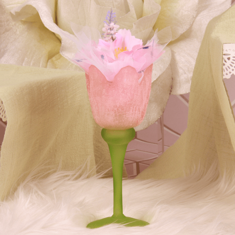 Une tulipe sur pied en verre effet givré rose (Ø8xH19cm), deux carrés filet blancs, un tulle rond en organza rose piquet pointillé bleu, un ruban voile bordure satin rose 10mm et un piquet fleur rose et tige de lavande (Ø8cm).