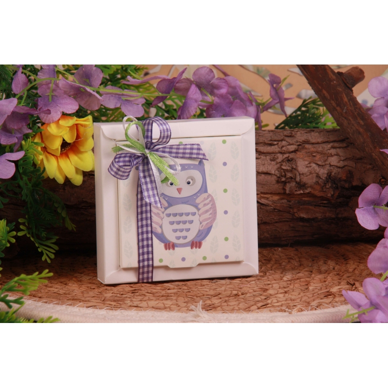 Une boite cartonnée blanche avec couvercle imprimée CHOUETTE (11*11*H2,5cm), un ruban en coton vichy parme 10mm, un ruban en satin blanc 3mm et un ruban en satin vert 3mm.
