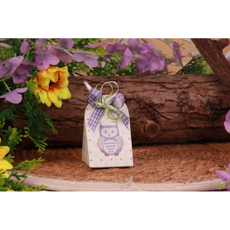 Une boite cartonnée forme trapèze imprimée CHOUETTE (5*5*H8cm), un ruban en coton vichy parme 10mm, un ruban en satin blanc 3mm et un ruban en satin vert 3mm.