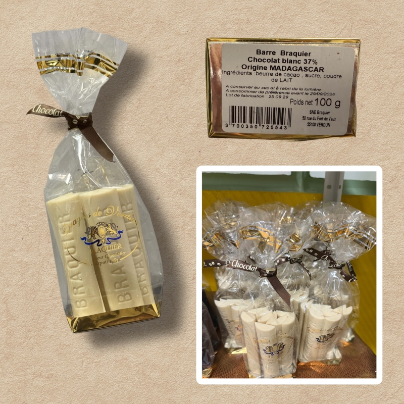 Fondante et facile à déguster, elle offre un goût délicatement sucré et crémeux, parfaitement équilibré. Son format en barre et son inscription BRAQUIER en font un chocolat pratique et parfait pour une pause gourmande.