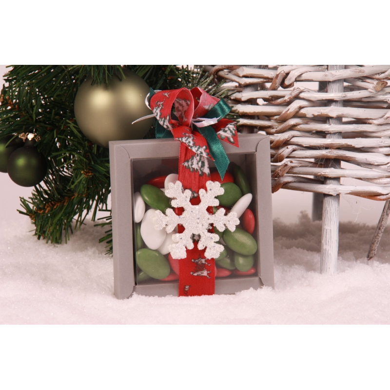 Une boite cartonnée 11x11xH3cm avec couvercle en PVC souple transparent, un ruban "CHRISTMAS VILLAGE" 25mm, un ruban en satin vert bouteille 10mm, un ruban en satin blanc 3mm et un flocon en feutrine blanc (Ø6cm).