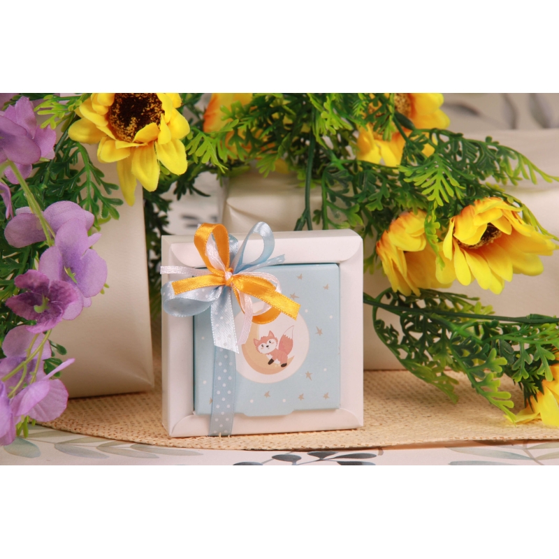 Une boite cartonnée blanche avec couvercle imprimé Renard sur Lune (8,5x8,5xH2,5cm), un ruban bleu ciel à pois blancs 10mm, un ruban en satin jaune 6mm et un ruban en satin blanc 3mm.