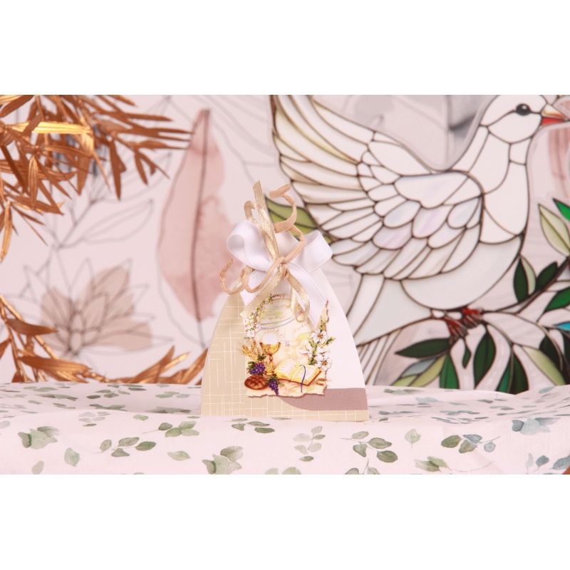 Une boite cartonnée imprimée dessin chrétien (7*4*H8cm), un ruban en satin mâte blanc 10mm, un ruban en satin taupe 3mm et une corde à croller beige 3mm.