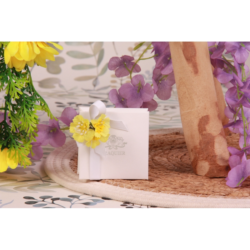 Un écrin blanc collection EXCLUSIVE siglée BRAQUIER argenté (7*7*H3cm), un ruban en satin mâte blanc 10mm et un bouquet de fleurs jaunes (Ø2,5cm).