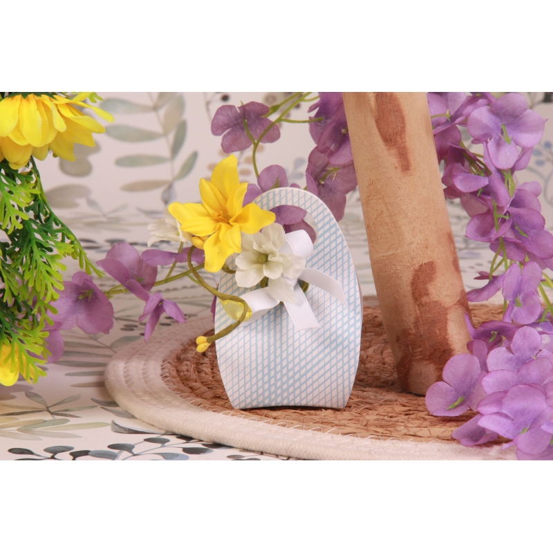Une boîte cartonnée collection exclusive BRAQUIER siglée de notre marque (au dos) (9*3*H10.5cm), un ruban en satin mâte blanc 10mm et un piquet Easter jaune et blanc (Ø4cm+Ø3cm).