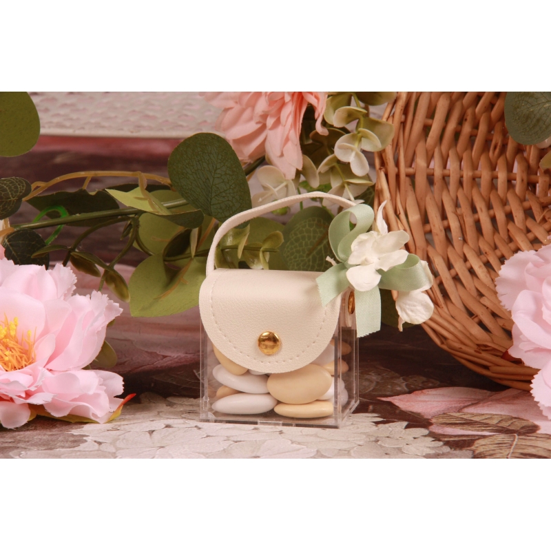 Une boite en PVC rigide transparente forme sac simili-cuir écru (6*4*H5cm), un ruban en satin mâte vert olive 10mm et une orthensia écru (Ø3cm)