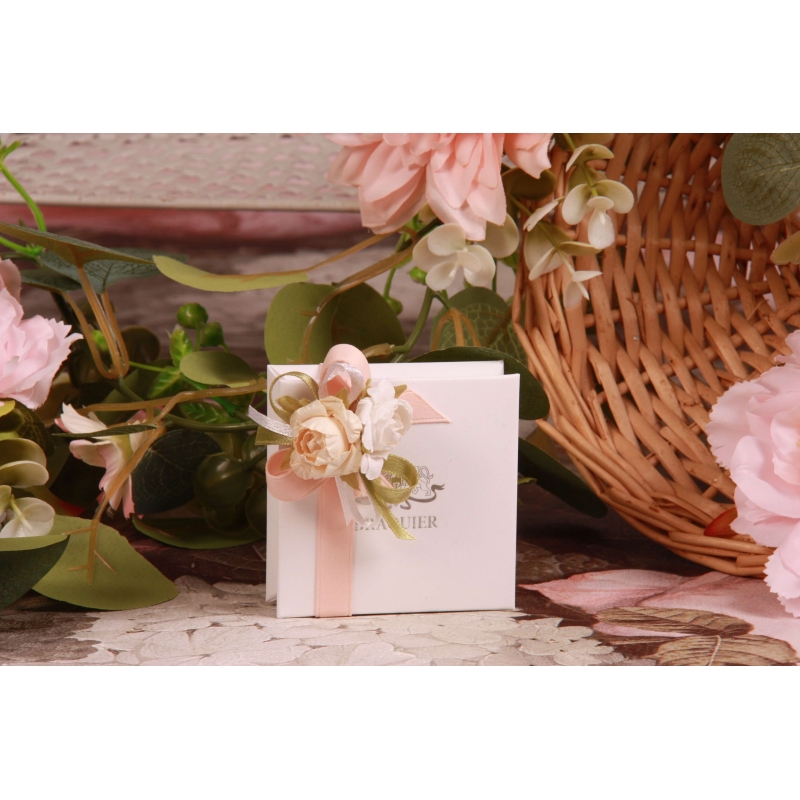 Un écrin blanc collection EXCLUSIVE siglée BRAQUIER argenté (7*7*H3cm), un ruban en satin mâte saumon 10mm, un ruban en satin blanc 3mm, un ruban en satin kaki 6mm, une Rose en papier blanche feuille verte (Ø3cm) et un Rose en papier écrue feuille verte (Ø3cm).