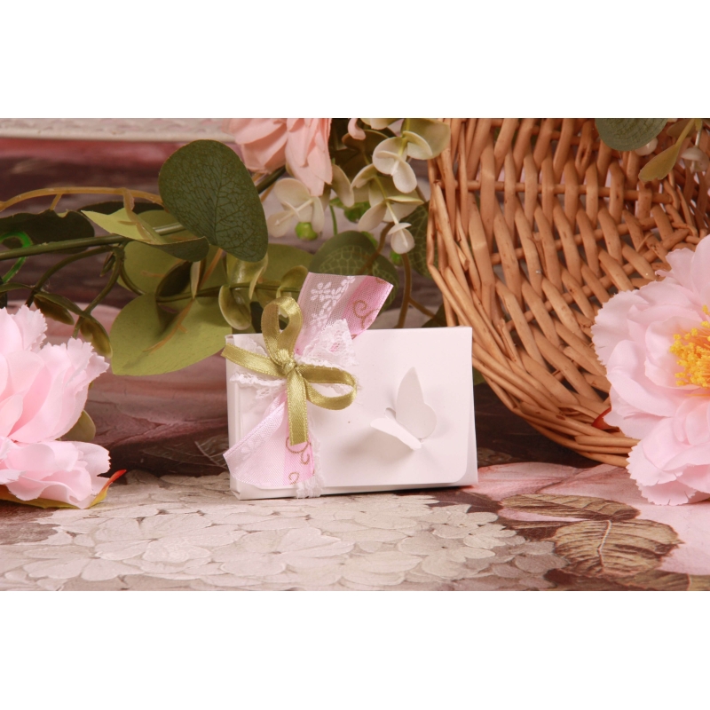 Une boite cartonnée blanche papier en relief (5*8*H2cm), un ruban en voile rose arabesques dorés 40mm, un ruban en dentelle blanc 15mm et un ruban en satin kaki 6mm.