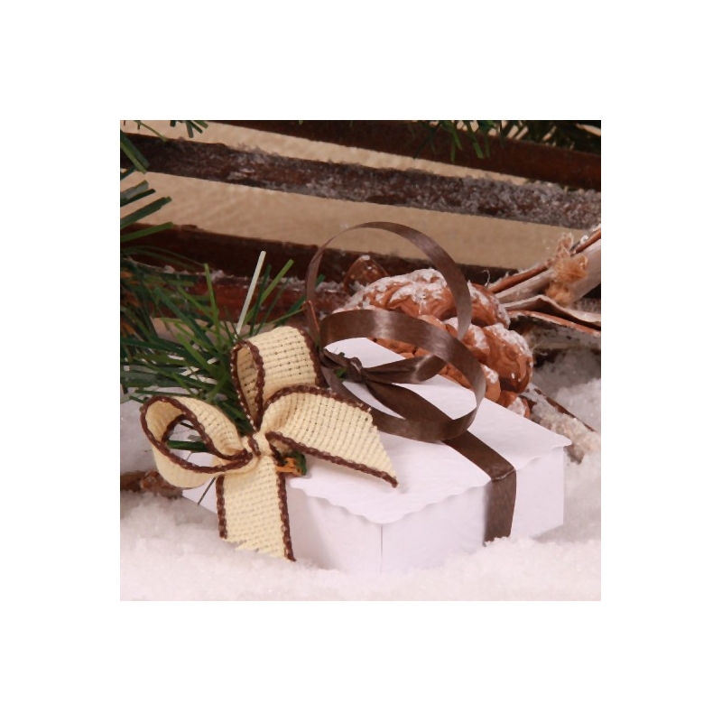 Une boite cartonnée rectangulaire effet écrin (5,5x7,5xH2,5cm), un ruban en coton écru bordure chocolat 15mm, un bolduc marron 7mm et une branche de sapin artificiel.