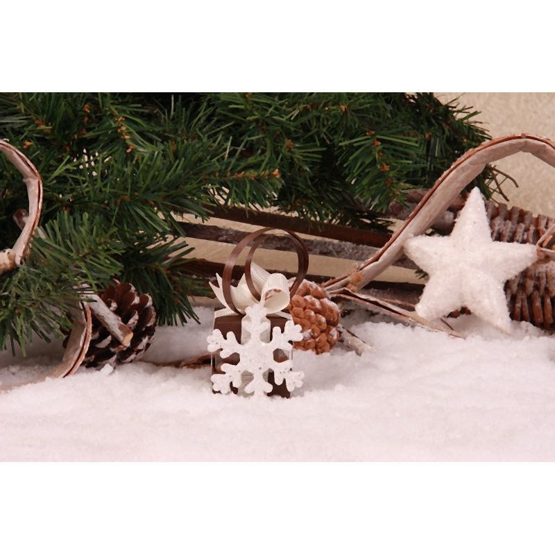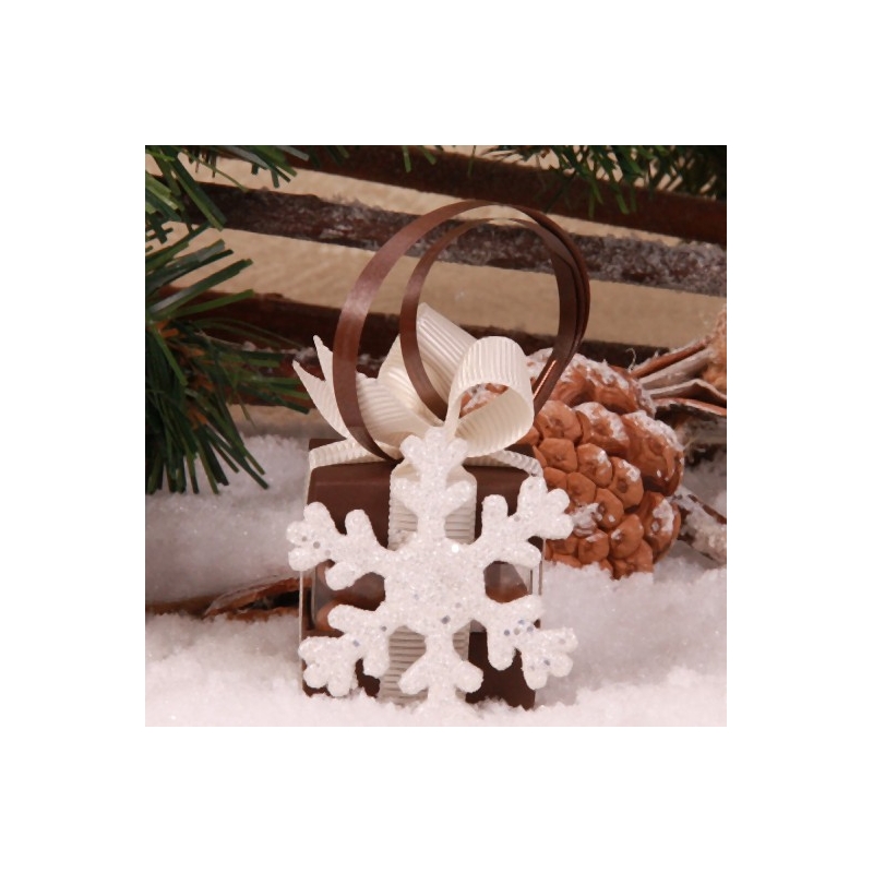 Une boite transparente, extrémités cartonnés chocolat (4x4cm), un ruban en coton strié écru 15mm, un bolduc marron 7mm et un flocon de neige blanc strass (diam6cm).
