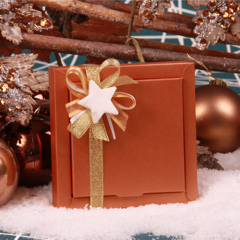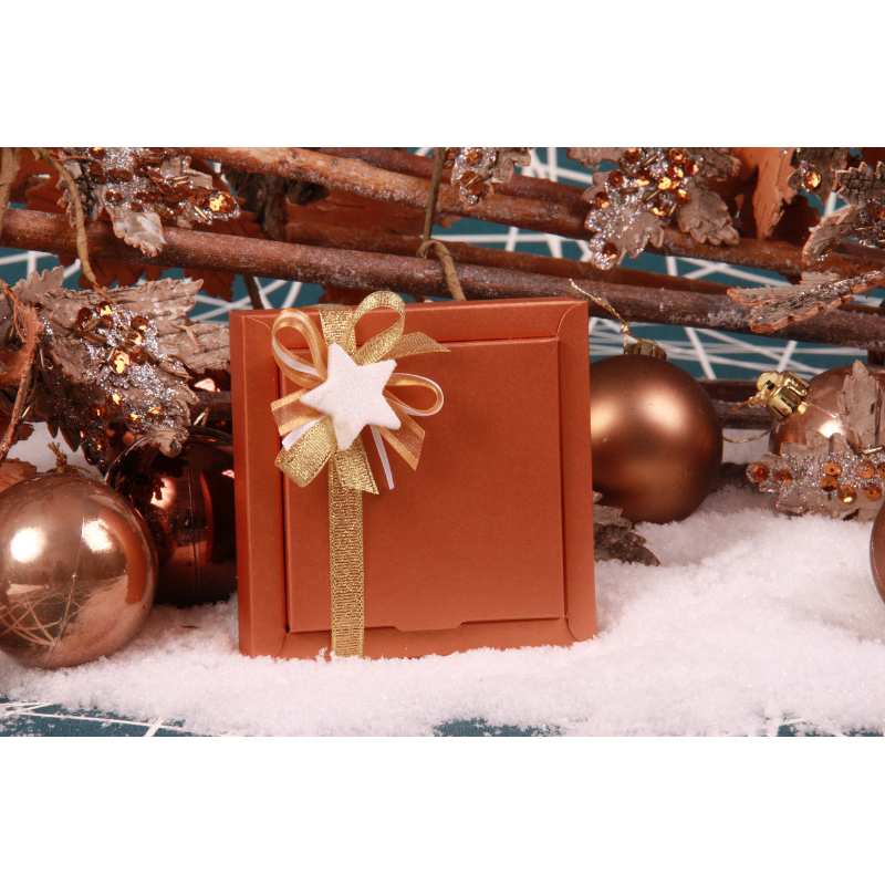 Une boite cartonnée avec couvercle gold (8,5x8,5xH3cm), un ruban organdi or 9mm, un ruban en satin blanc 3mm, un ruban voile bordure satin or 10mm et une étoile en feutrine blanche pailletée.