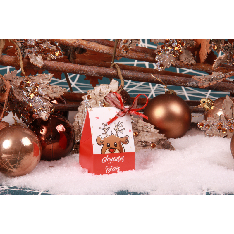 Une boite cartonnée imprimée renne de Noël (5x5xH8cm), un ruban voile bordure satin brun 10mm et un ruban en satin rouge 3mm.