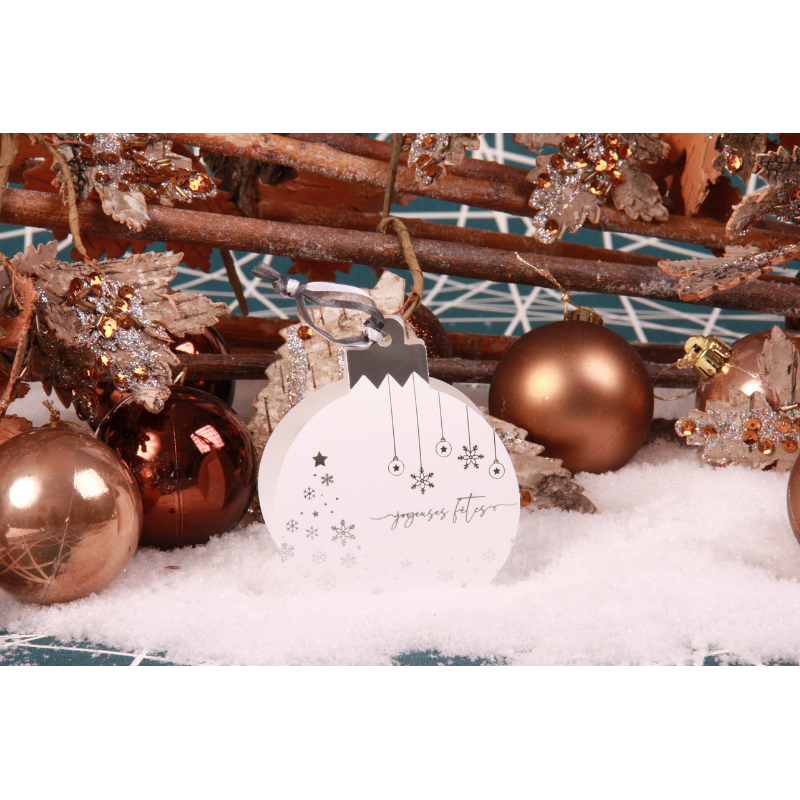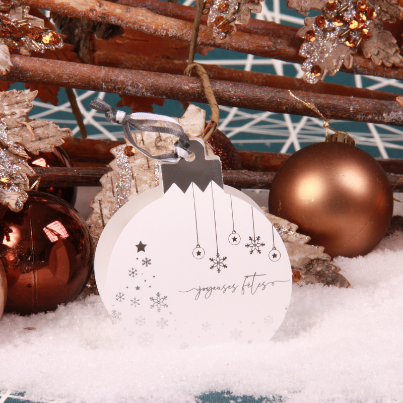 Une boite cartonnée blanche imprimée sapin et flocon argentés forme boule de noël (3,5x8,5xH9,5cm), un ruban voile bordure satin gris 10mm et un ruban en satin blanc 3mm.