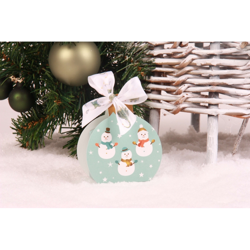 Une boite cartonnée imprimée bonhomme de neige forme boule de noël (3,5x8,5xH9,5cm) et un ruban en satin imprimé Bonhomme de neige 25mm.