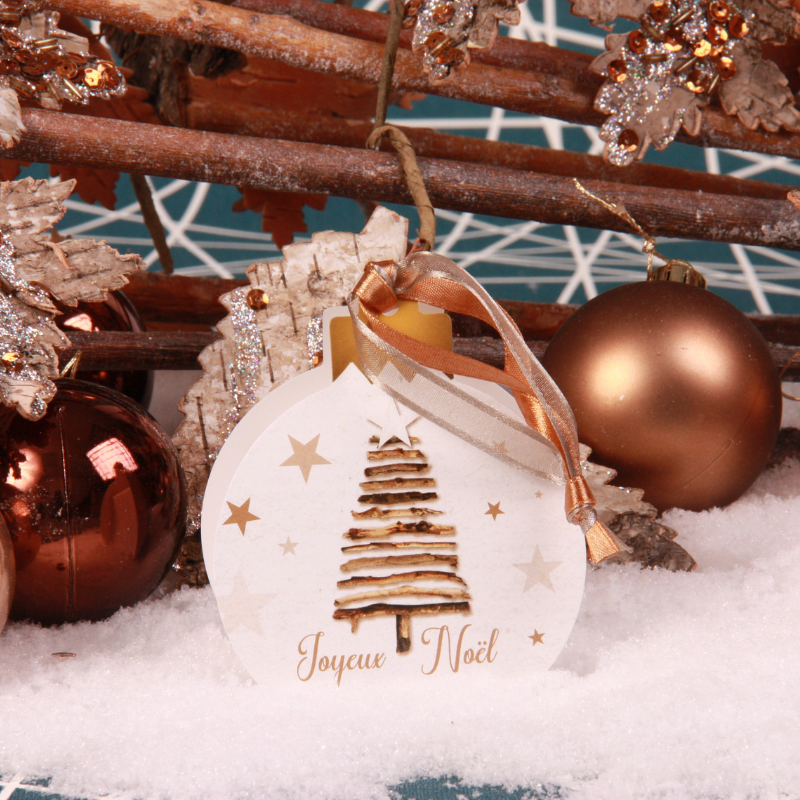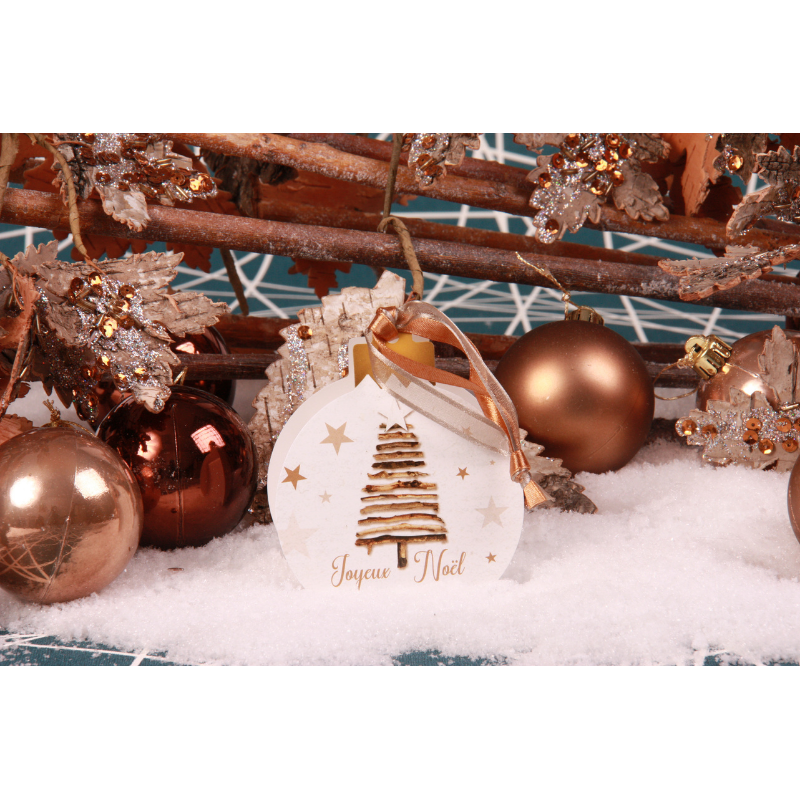 Une boite cartonnée forme boule de noël imprimée sapin en bois (3,5x8,5xH9,5cm), un ruban voile bordure satin brun 10mm et un ruban en satin cuivré 3mm.